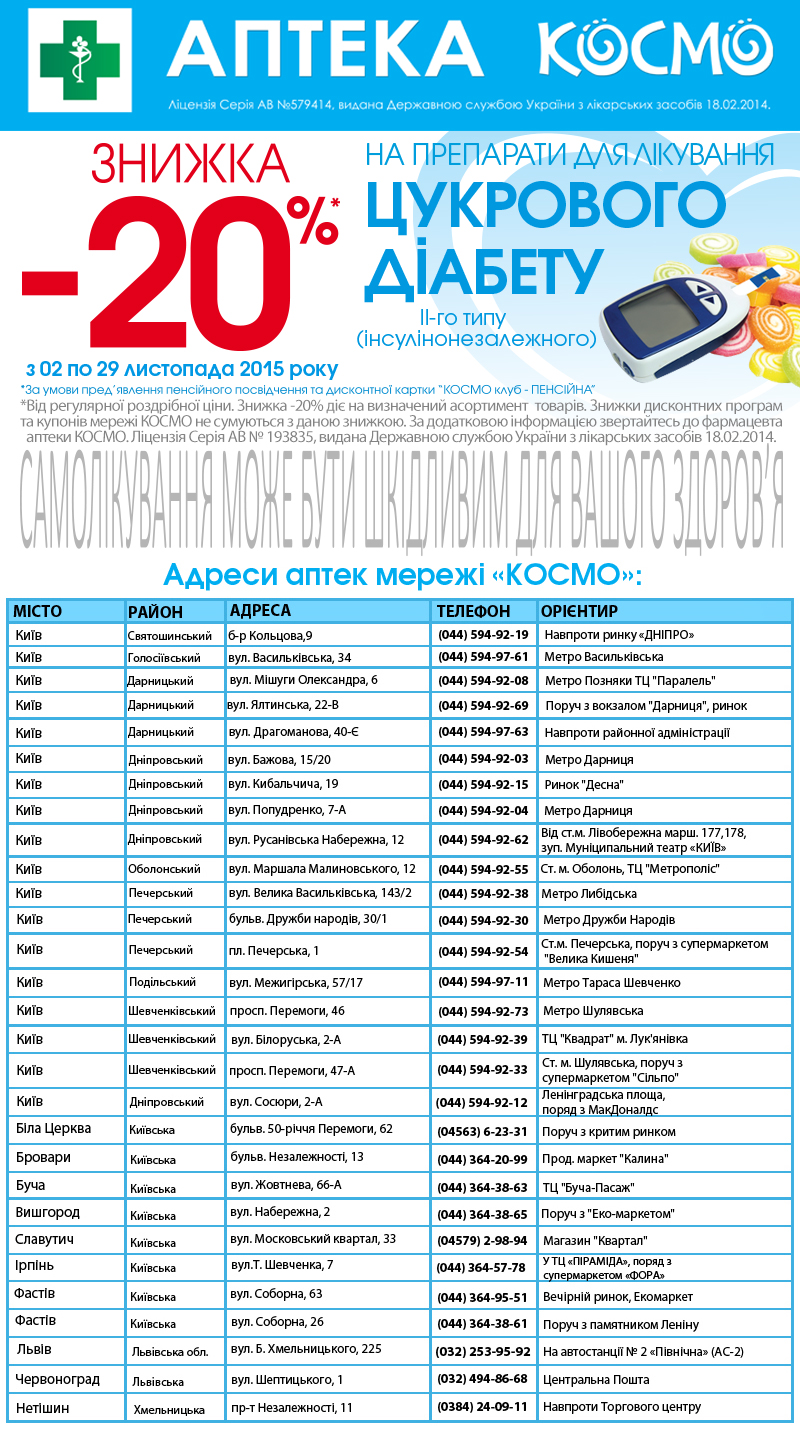 Описание акции: | В АПТЕКАХ КОСМО - ЗНИЖКА -20% НА ПРЕПАРАТИ ДЛЯ ЛІКУВАННЯ ЦУКРОВОГО ДІАБЕТУ II-ТИПУ (ІНСУЛІНОНЕЗАЛЕЖНОГО).![]() | ||||||