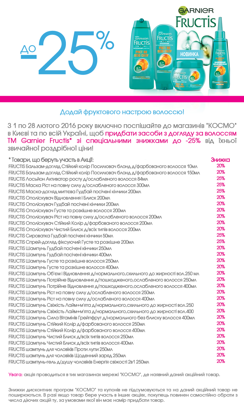Описание акции: | ДОГЛЯД ЗА ОБЛИЧЧЯМ ТА ВОЛОССЯМ ВІД ТМ GARNIER НА 25% ДЕШЕВШЕ!![]() | ||||||
