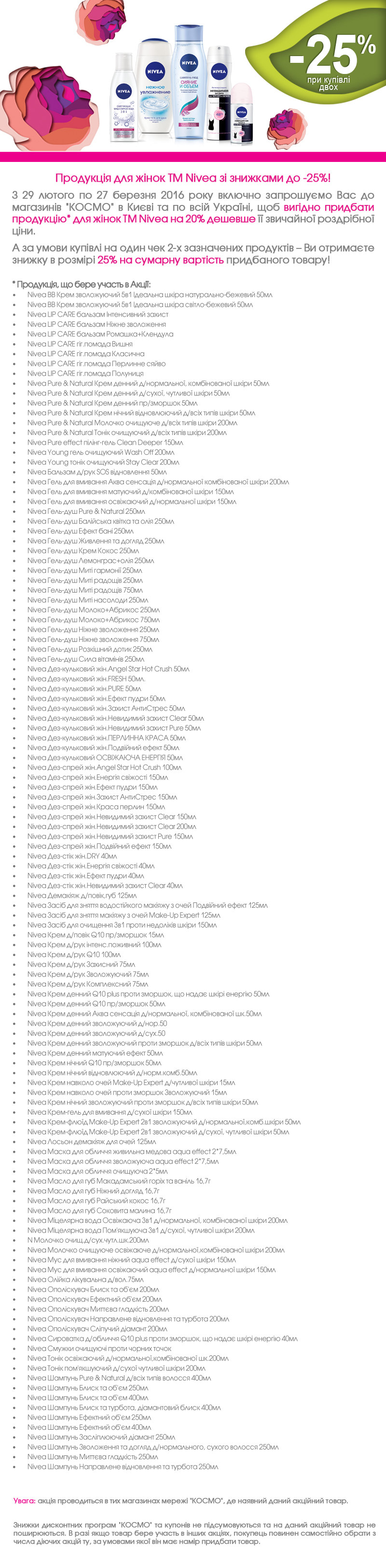 Описание акции: | ПРОДУКЦІЯ ДЛЯ ЖІНОК ТМ NIVEA ЗІ ЗНИЖКАМИ ДО -25%!![]() | ||||||
