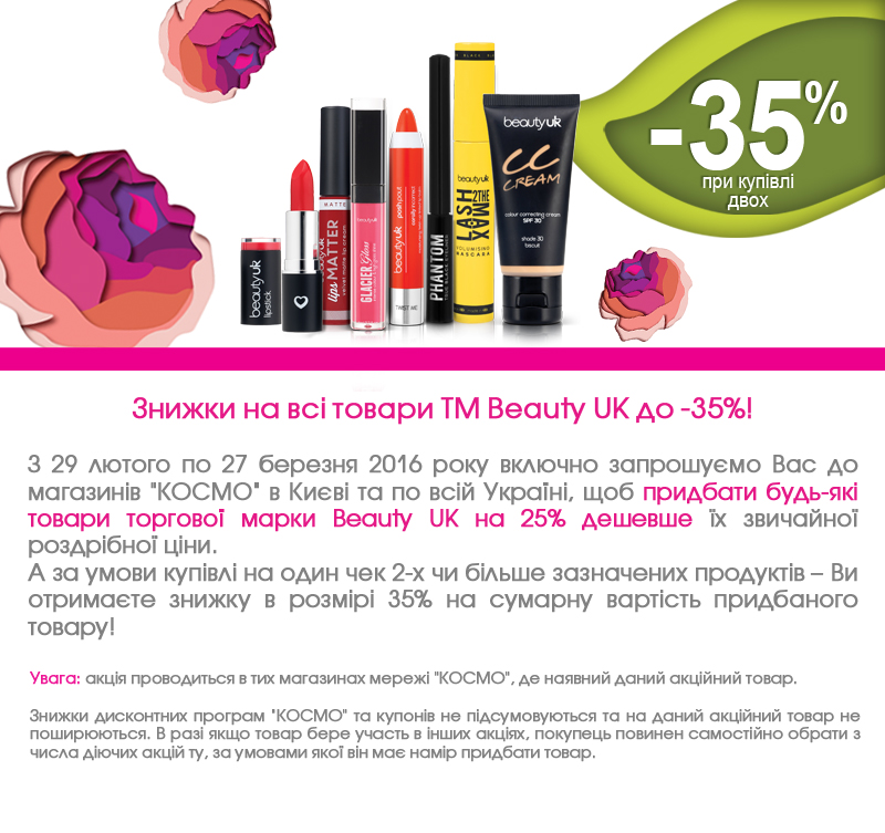 Описание акции: | ДЕКОРАТИВНА КОСМЕТИКА: ЗНИЖКИ НА ВСІ ТОВАРИ ТМ BEAUTY UK ДО -35%!![]() | ||||||
