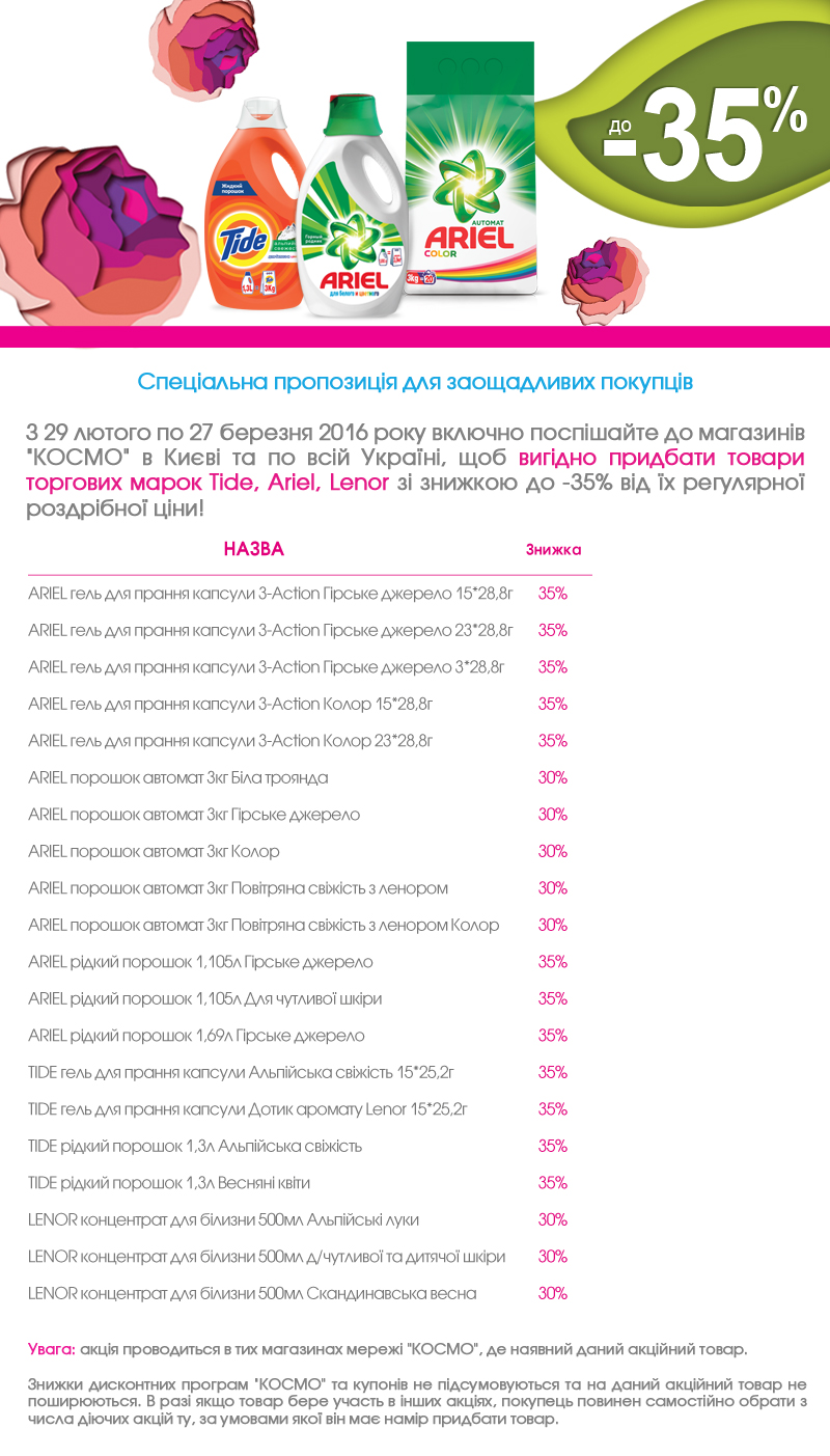 Описание акции: | ЗНИЖКА НА ТОВАРИ ДЛЯ ПРАННЯ ТМ TIDE, ARIEL, LENOR – ДО 35%!![]() | ||||||