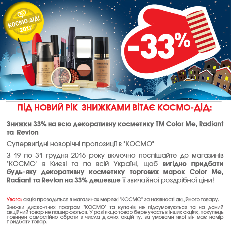 | Описание акции: | ЗНИЖКИ ВІД КОСМО-ДІДА: -33% НА ВСЮ ДЕКОРАТИВНУ КОСМЕТИКУ ТМ COLOR ME, RADIANT ТА REVLON![]() | ||||||