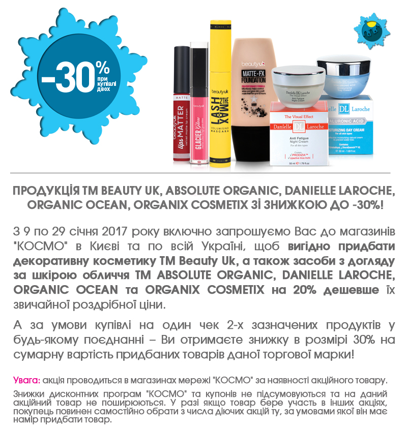 | Описание акции: | Продукція ТМ BEAUTY UK, ABSOLUTE ORGANIC, DANIELLE LAROCHE, ORGANIC OCEAN, ORGANIX COSMETIX зі знижкою до -30%!![]() | ||||||
