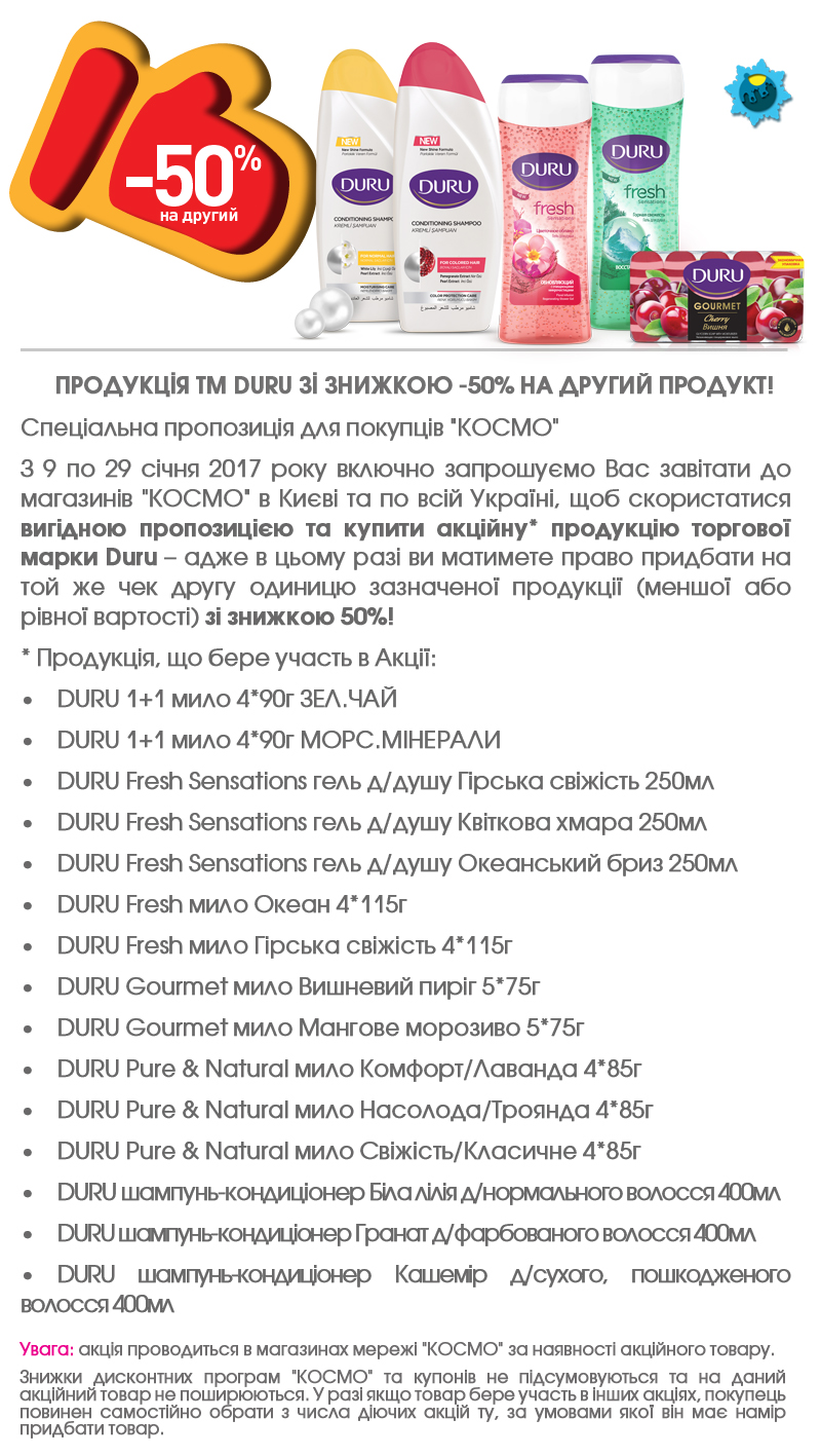 | Описание акции: | Другий продукт ТМ DURU зі знижкою - 50%![]() | ||||||