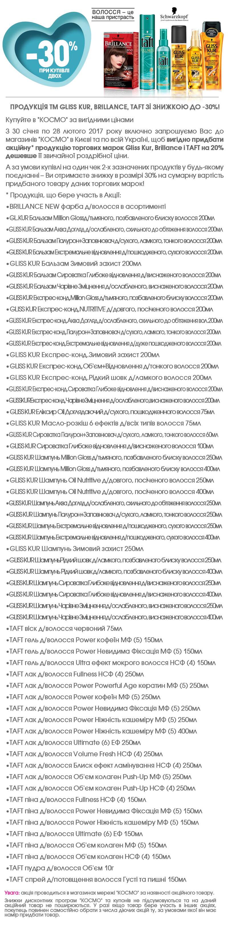 | Описание акции: | Продукція ТМ GLISS KUR, BRILLANCE, TAFT зі знижкою до -30%!![]() | ||||||