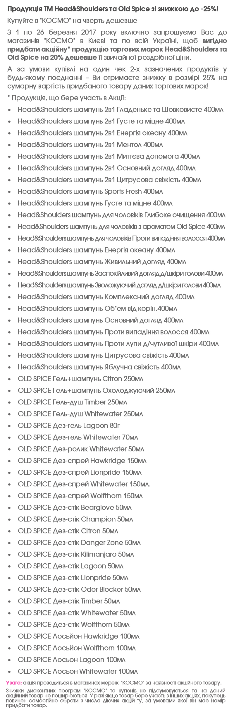 | Описание акции: | Продукція ТМ HEAD&SHOULDERS та OLD SPICE зі знижкою до -25%![]() ![]() | ||||||