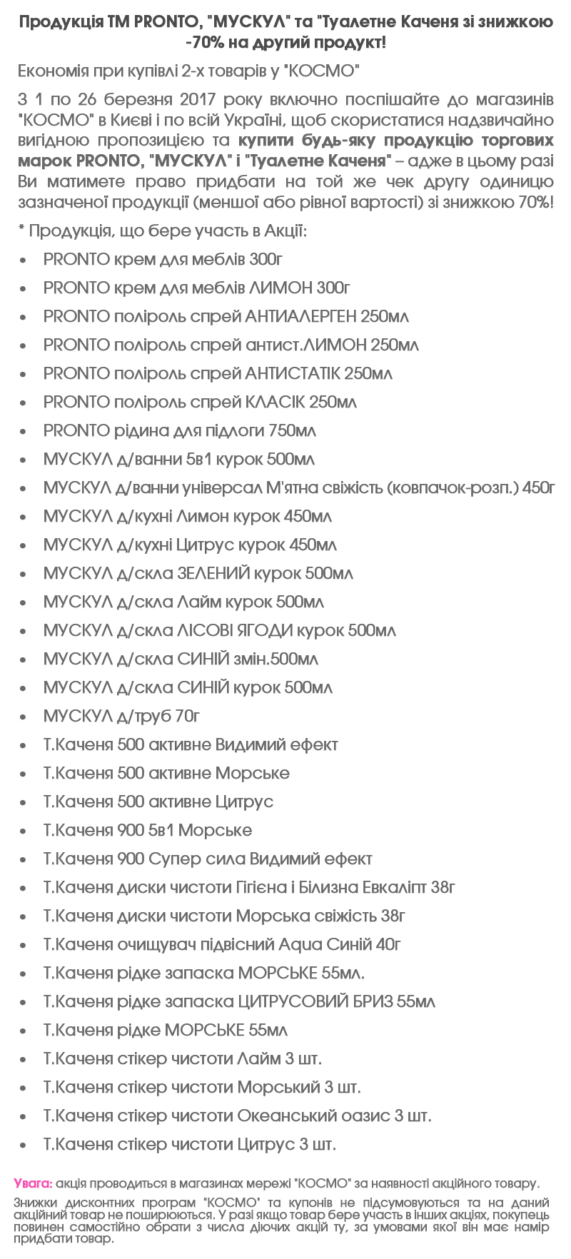 | Описание акции: | Другий продукт ТМ PRONTO, "МУСКУЛ" та "ТУАЛЕТНЕ КАЧЕНЯ" зі знижкою -70% ![]() ![]() | ||||||