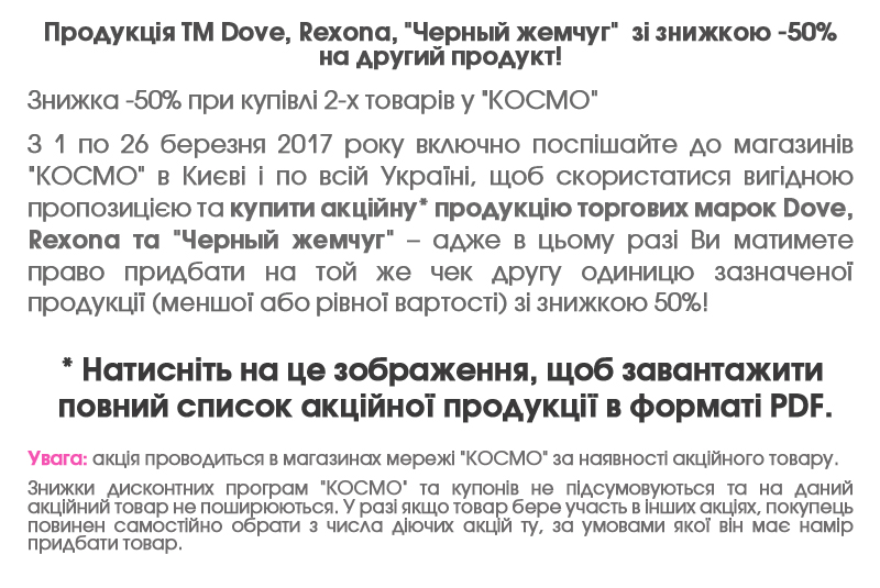| Описание акции: | Другий продукт ТМ DOVE, REXONA, "ЧЕРНЫЙ ЖЕМЧУГ" удвічі дешевше!![]() ![]() | ||||||