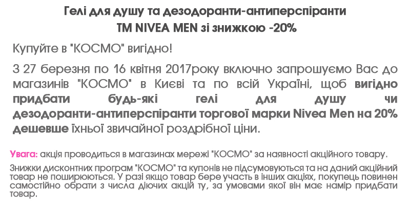 | Описание акции: | Гелі для душу та дезодоранти-антипреспіранти ТМ NIVEA MEN зі знижкою -20% ![]() ![]() | ||||||