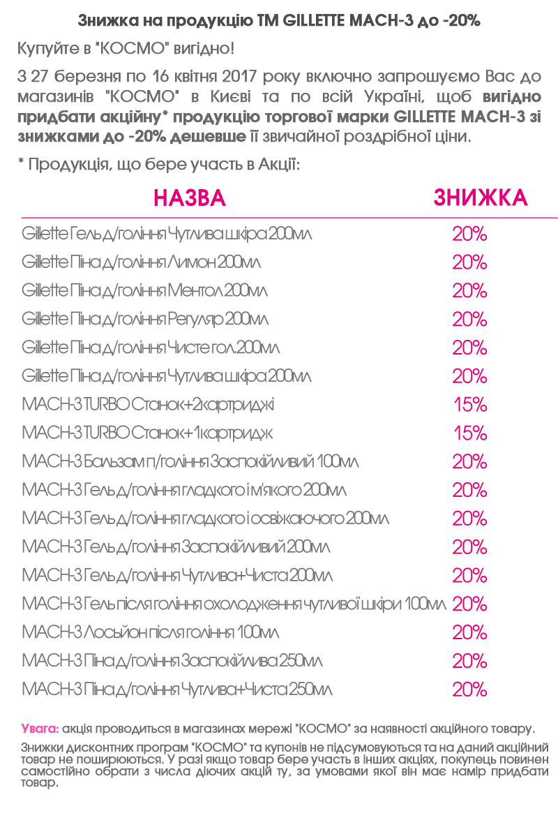 | Описание акции: | Знижка на продукцію ТМ GILLETTE MACH до -20% ![]() ![]() | ||||||