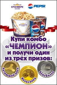 Описание акции: | Акция "Чемпион"! Призы за попкорн и Pepsi: велосипед, фрисби или бейсболка за покупку комбо-набора "Чемпион"! При покупке комбо-набора "Чемпион" (большой стакан попкорна и 2 стакана Pepsi по 1л) в баре кинотеатров "Кронверк Синема" вы получаете скретч-карту, стерев защитный слой на которой, вы узнаете название приза, который получите: велосипед, фрисби или бейсболку. ![]() | ||||||