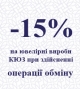 Описание акции: | С 01.11.2011 по 30.11.2011 в фирменных магазинах Киевского ювелирного завода действует скидка – 15% на ювелирные изделия при совершении операции обмена. - скидка действует на ювелирные изделия производства ПАО «Киевский ювелирный завод»; - сумма покупки зачисляется на депозит дисконтной карты; - скидка не используется в совокупности с другими акциями и не суммируется с другими скидками, которые действуют в сети КЮЗ (если это не предусмотрено условиями акции). | ||||||