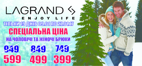 | Описание акции: | "LAGRAND" дарує небувалі знижки! торговий центр Київ ![]() В магазинах LAGRAND можна придбати чоловічі й жіночі штани за спеціальними цінами: - 399 грн. замість 749 грн .; - 499 грн. замість 849 грн .; - 599 грн. замість 949 грн! Завітайте до галереї бутиків ТЦ "Ашан Петрівка", Подільські Ворота. | ||||||