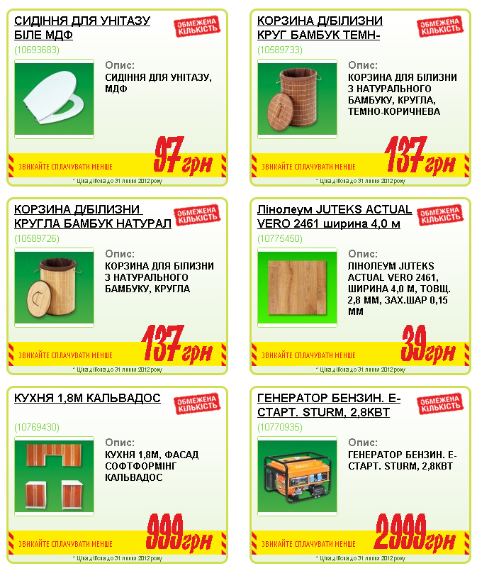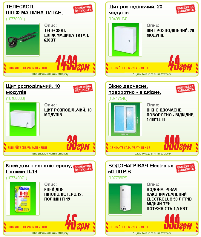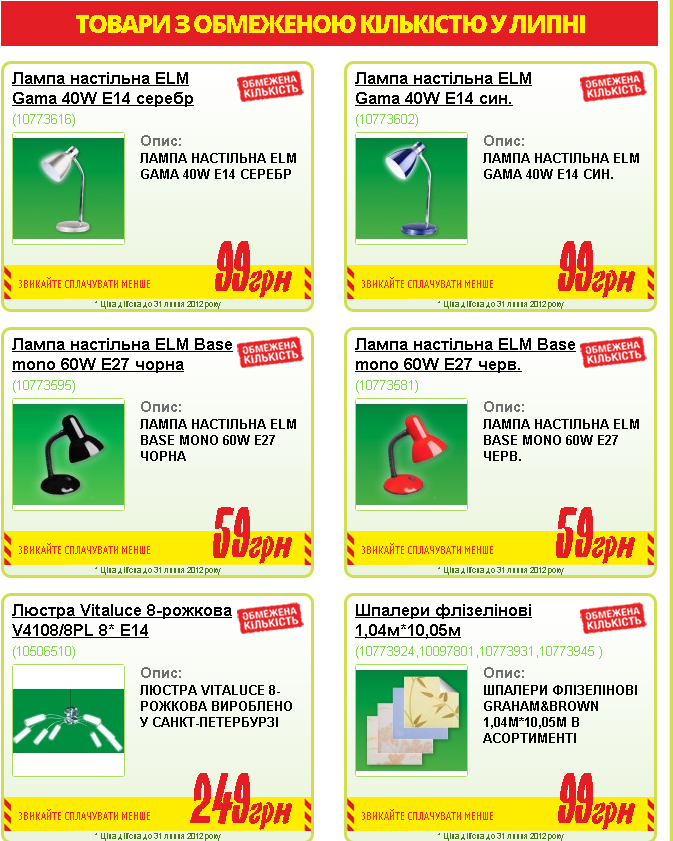 Описание акции: | Товари з обмеженою кількістю і по супер цінам у липні: Шпалери флізелінові 1,04м*10,05м - 99 грн., Люстра Vitaluce 8-рожкова V4108/8PL 8* E14 - 249 грн., Шпалери паперові 0,53х10,05 м - 19 грн., Вікно двочасне, поворотно - відкідне - 999 грн., Клей для пінополістеролу, Полімін П-19 - 45 грн..и т.д. ![]() ![]() ![]() | ||||||