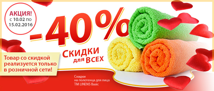 Описание акции: | Скидки 40% на полотенца для лица ТМ LINENS Basic. Товар со скидкой реализуется только в розничной сети! ![]() | ||||||