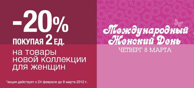 Описание акции: | Акція з нагоди 8 березня! 20% знижки, купуючи 2 одиниці з нової колекції товарів для жінок. *акція діє з 24 лютого до 8 березня 2012 р. ![]() | ||||||