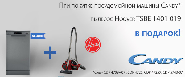 | Описание акции: | При покупке посудомойной машины Candy CDP 5743-07, CDP4709x-07, CDP4725, CDP4725Х — в подарок пылесос Hoover TSBE 1401 019.![]() | |