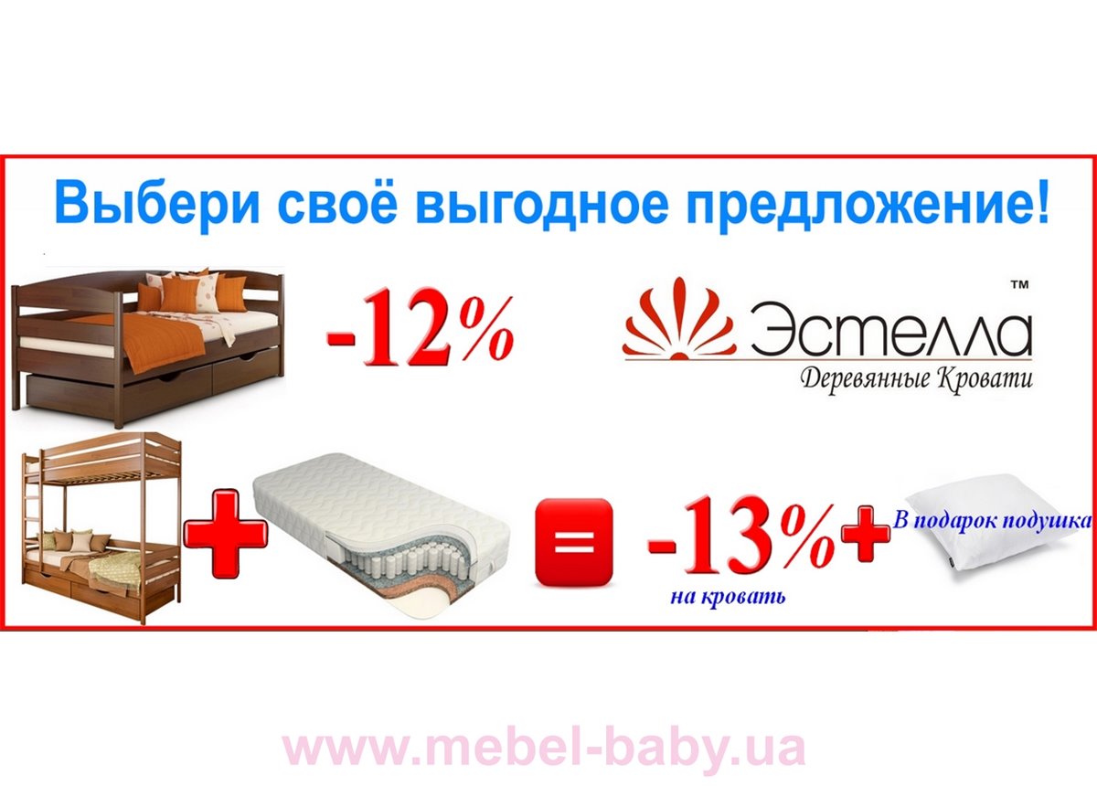 Описание акции: | Акция на кровати и матрасы 1. При покупке любой кровати ТМ "Эстелла" - вы гарантировано получаете скидку на кровать 12%. 2. При покупке кровати ТМ "Эстелла" и одного матраса стоимостью от 2- х тыс. грн. получайте скидку на кровать 13% + подушку в подарок. 3. При покупке кровати ТМ "Эстелла" и 2-х матрасов стоимостью от 2- х тыс. за матрас, получайте скидку на кровать 13% + 2 подушки в подарок. ![]() | ||||||