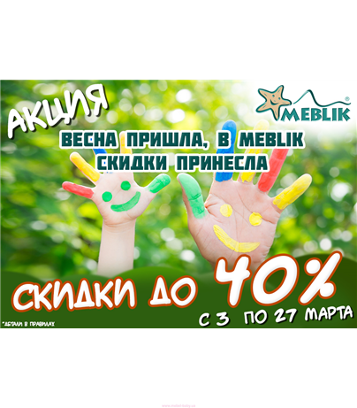 | Описание акции: | ![]() Акции от ТМ Meblik "«Весна пришла, в Meblik скидки принесла!" ПРАВИЛА АКЦИИ 1. Организатором является представитель марки MEBLIK® в Украине. Условия Акции «Весна пришла, в Meblik скидки принесла!» определены данными правилами. 2. Акция действует на территории Украины. 3. Акция предназначена для розничных клиентов. 4. Акция продолжается с 3 по 27 марта 2017 года. Акция действует только в салонах и бренд секциях Meblik указанных на сайте: www.meblik.com.ua в закладке "Адреса салонов" www.meblik.com.ua/adresa-salonov/ и на сайте www.mebel-baby.kiev.ua Во время действия акции каждый клиент, совершающий заказ на мебель и/или аксессуары марки MEBLIK® на минимальную сумму 9 999 гривен получает возможность приобрести каждый 2-й, более дешевый модуль из своего заказа со скидкой, соответствующий размер которой для каждого из порогов указан в таблице. Т.е., при заказе, состоящем из 5 модулей, скидка предоставляется на 2-й, 4-й модули, в порядке убывания их стоимости. | ||||||