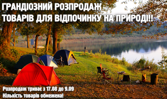 Описание акции: | Грандіозний розпродаж товарів для відпочинку на природі! В акції беруть участь: намети, спальні мішки, шезлонги, парасолі пляжні, матраци, басейни, садові мебелі... Кількість товарів обмежена! ![]() | ||||||