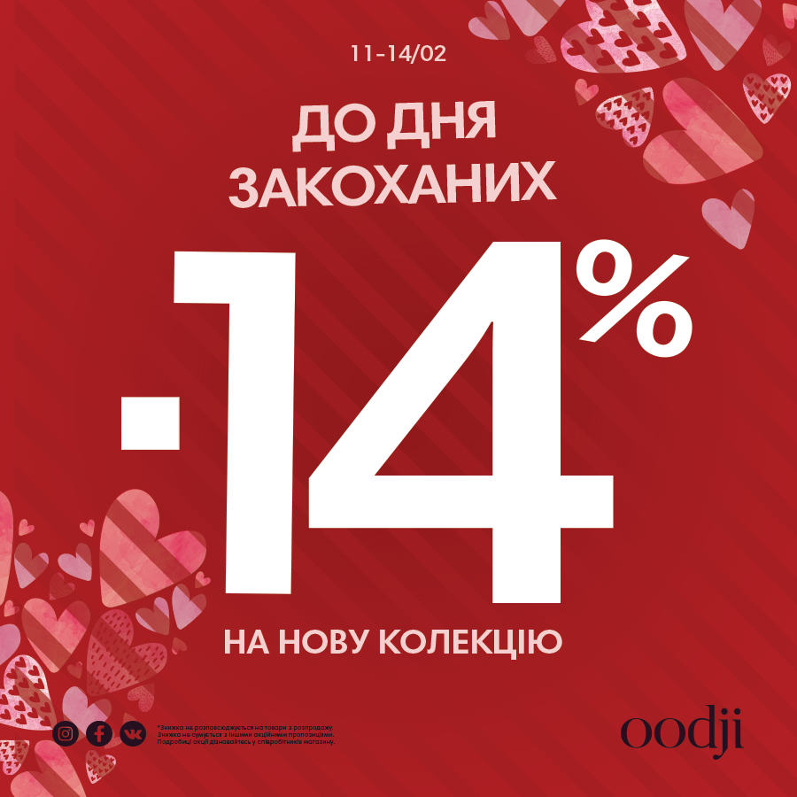 | Описание акции: | ![]() Більше, за кохання! -14% на ВСЮ нову колекцію в oodji з 11 по 14 лютого! Happy Valentine's Day! | ||||||
