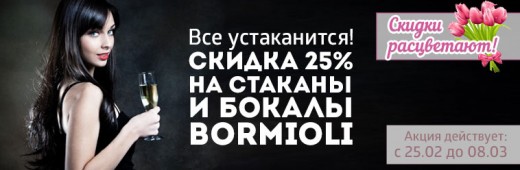 Описание акции: | Все устаканится! Скидка 25% на бокалы и стаканы Bormioli.![]() | ||||||