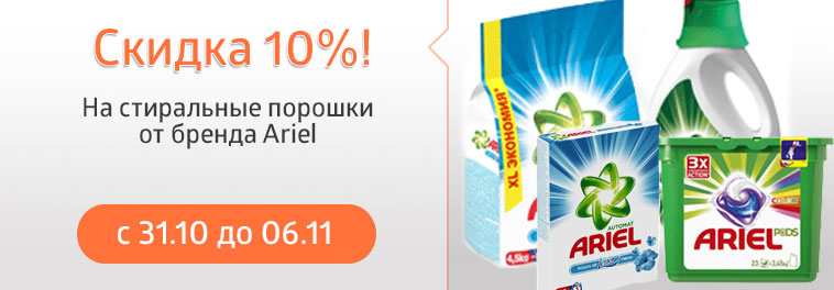 | Описание акции: | ![]() На стиральные порошки Ариель скидка 10% | ||||||