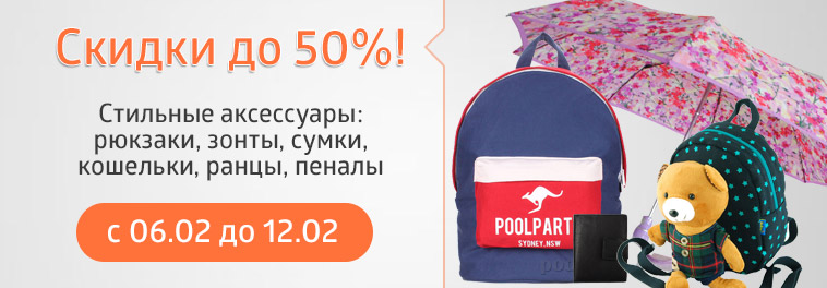 | Описание акции: | Скидки до -50% на стильные аксессуары: рюкзаки,зонты, сумки, кошельки![]() | ||||||