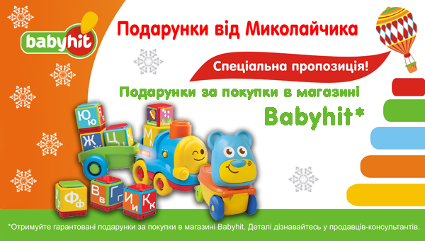 З нагоди Дня Святого Миколая, дитячий магазин Babyhit дарує щедрі подарунки своїм покупцям! Завітайте до магазину в період з 18 по 26 грудня, здійсніть покупки та гарантовано отримуйте ПОДАРУНКИ!* - іграшки від ТМ B’kids: Музичний «Потяг-алфавіт», розвиваюча іграшка «Великий автобус», валізка «Ведмежатко», «Вантажівка з набором інструментів» та багато іншого!