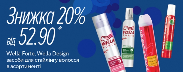 Погода кожного дня випробовує вашу зачіску на стійкість? Не впевнені, що зачіска витримає танцювальний марафон або відчайдушні конкурси? Багато проблем – одне рішення. Засоби для стайлінгу Wella Design і Wella Forte. Ніщо не завадить вашій зачісці виглядати ефектно. Купуйте з 26.01.2016 до 15.02.2016 Wella Forte всього за 52.90 грн або Wella Design за 63.90 грн.