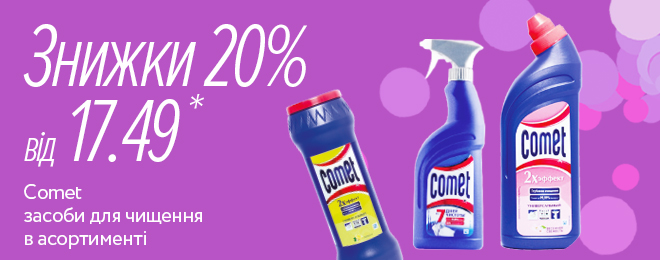 Описание акции: | Занадто переймаєтеся чистотою та гігієною вашого будинку. Не варто пити заспокійливе. Краще купуйте миючі та чистячі засоби ТМ Comet зі знижкою 20%. Всього 17.49 грн і ви відчистите складні плями, знищите мікроби, дезінфікуєте поверхні. Крім того, Comet пропонує новинку – «24/7 Догляд», який чудово впорається з прибиранням тих приміщень, в яких бруд та бактерії з’являються особливо швидко – в туалеті та ванній.![]() | ||||||