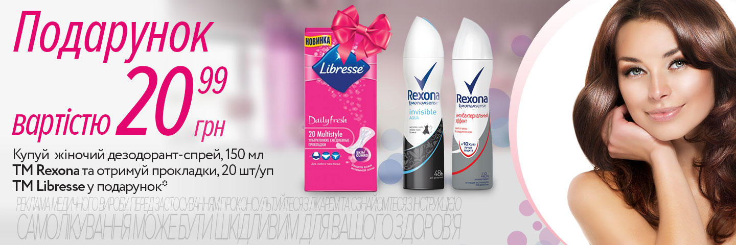 | Описание акции: | Зима – время подарков Покупайте женский дезодорант-спрей, 150 мл торговой марки Rexona и получайте прокладки Libresse, 20 шт/уп в подарок*. ![]() * Под подарком подразумевается покупка товара за 0.01 грн с учетом НДС. Компания оставляет за собой право обеспечить наличие акционного товара не во всех магазинах сети PROSTOR, а также изменять цены в период действия предложения. Товары не подлежат оптовой продажи. Оптовой считается покупка более 2-х единиц одного товара. ВНИМАНИЕ! Количество акционного товара ограничено! Фото товаров могут отличаться от товаров, находящихся в продаже. | ||||||