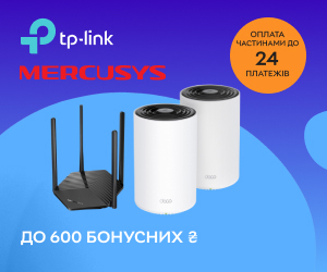 | Описание акции: | Начисляем до 600 бонусных ₴ или оплата частями до 24 платежей на сетевое оборудование TP-Link и Mercusys!![]() | ||||||