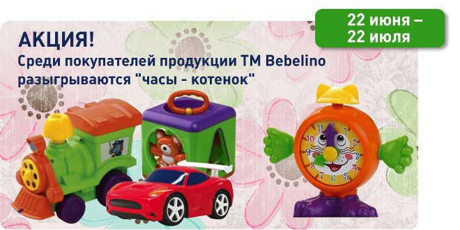 Описание акции: | Каждый покупатель продукции ТМ Bebelino может принять участие в розыгрыше двух дестких будильников "часы - котенок" от Bebelino! Для участия в розыгрыше необходимо отправить на электронный адрес rebenok@rozetka.ua полное название продукта, приобретенного в период акции, номер заказа, имя, фамилию и контактный телефон. ![]() | ||||||