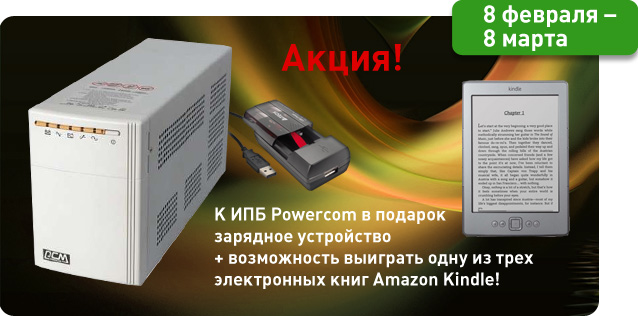 Описание акции: | Акция! ![]() Каждый покупатель акционных источников бесперебойного питания Powercom получает в подарок зарядное устройство для батареек типа АА и ААА! А также принимайте участие в розыгрыше одной из трех электронных книг Amazon Kindle! Для участия в розыгрыше необходимо отправить на электронный адрес konkurs@rozetka.ua полное название продукта, приобретенного в период акции, номер заказа, имя, фамилию и контактный телефон. Спешите, количество подарков ограничено! Выдача выигрыша производится в нашем выставочном зале по адресу г. Киев, ул. Фрунзе, 40. | ||||||