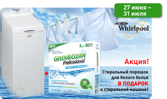 Описание акции: | Акция! Каждый покупатель стиральной машины WHIRLPOOL AWE 9630, с вертикальной загрузкой, гарантировано получает в подарок стиральный порошок для белой одежды GREEN&CLEAN 3 кг! Количество подарков ограничено! ![]() | ||||||