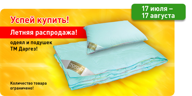 Описание акции: | Летняя распродажа одеял и подушек торговой марки Даргез! Одеяло - 309 грн., 358 грн.,... Подушка - 98 грн., 155 грн.... ![]() | ||||||