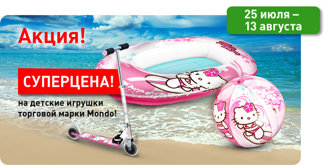 Описание акции: | Акция! Суперцена на акционные детские игрушки торговой марки Mondo! Надувные нарукавники Hello Kitty Mondo - 24 грн., Самокат Mondo - 334 грн., 350 грн. и т.д. ![]() | ||||||
