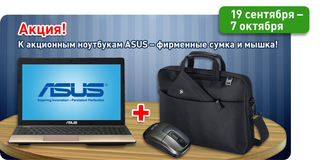 Описание акции: | Каждый покупатель акционных ноутбуков ASUS получает в подарок фирменную сумку Asus Slim LGE и мышку Asus Wireless WT400 Grey!![]() | ||||||