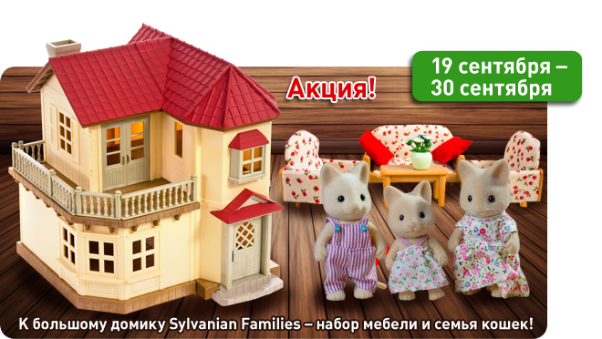 Описание акции: | Акция! Каждый покупатель набора Sylvanian Families "Большой домик" получает в подарок набор аксессуаров Sylvanian Families "Мягкая мебель для гостинной" и набор Sylvanian Families "Семья Кошек"! Набор Sylvanian Families "Большой домик" + свет 972 грн. ![]() | ||||||