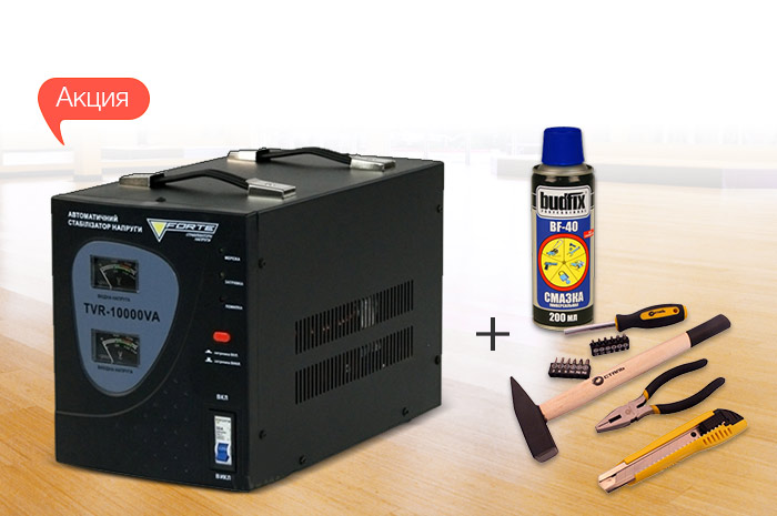 Каждый покупатель акционных стабилизаторов напряжения Forte получает в подарок набор ручных инструментов и смазку-спрей! ![]() | |