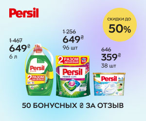 | Описание акции: | Скидки до 50% на средства для стирки Persil. Покупайте, оставляйте отзывы и мы вернем 50 бонусных грн на ваш счет!![]() | ||||||