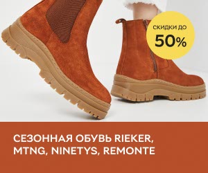 | Описание акции: | Скидки до 50% на мужские и женские ботинки, сапоги, кроссовки и другую обувь RIEKER, MTNG, Ninetys, Remonte!![]() | ||||||
