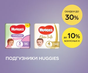 | Описание акции: | При покупке подгузников Huggies со скидками до 30% возвращаем до 10% бонусами от суммы покупки!![]() | ||||||