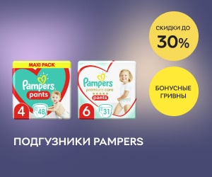 | Описание акции: | При покупке подгузников и подгузников-трусиком Pampers со скидками до 30% возвращаем до 220 бонусных гривен!![]() | ||||||