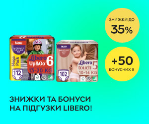 | Описание акции: | Скидка до 35% и моментальный бонус 50 грн при покупке подгузников Libero!![]() | ||||||
