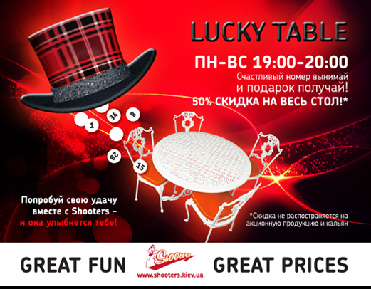 Описание акции: | Lucky table! Пн-Вс 19:00 - 20:00: Счастливый номер вынимай и подарок получай - 50% скидки на весь стол!* *Скидка не распостраняеться на акционную продукцию и кальян ![]() | ||||||
