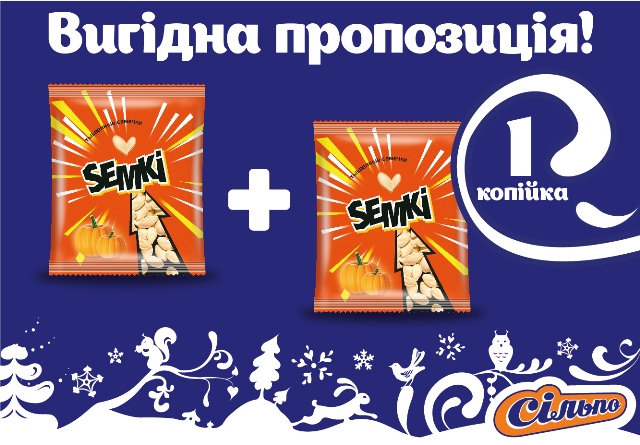 Описание акции: | Придбайте 1 упаковку нечищеного гарбузового насіння ТМ Semki (40 г) та візьміть другу таку саму упаковку лише за 1 копійку!![]() | ||||||