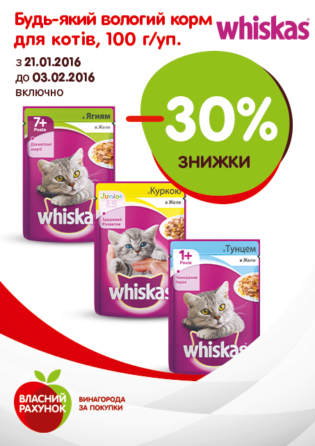Описание акции: | З 21 січня до 3 лютого 2016 року включно в супермаркетах «Сільпо» діє акція на будь-який вологий корм для котів Whiskas®, 100 г/уп. – знижка 30% на кожну одиницю акційної продукції у чеку.![]() | ||||||