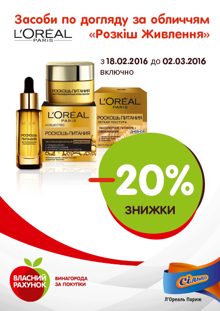 З 18 лютого до 2 березня 2016 року включно в супермаркетах «Сільпо» діє акція на будь-які засоби для догляду за обличчям L’Oreal Paris® «Розкіш живлення» – 20% знижки на кожну одиницю акційної продукції у чеку.